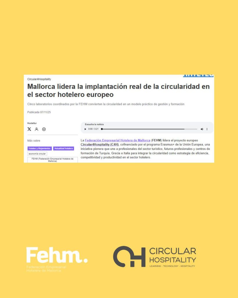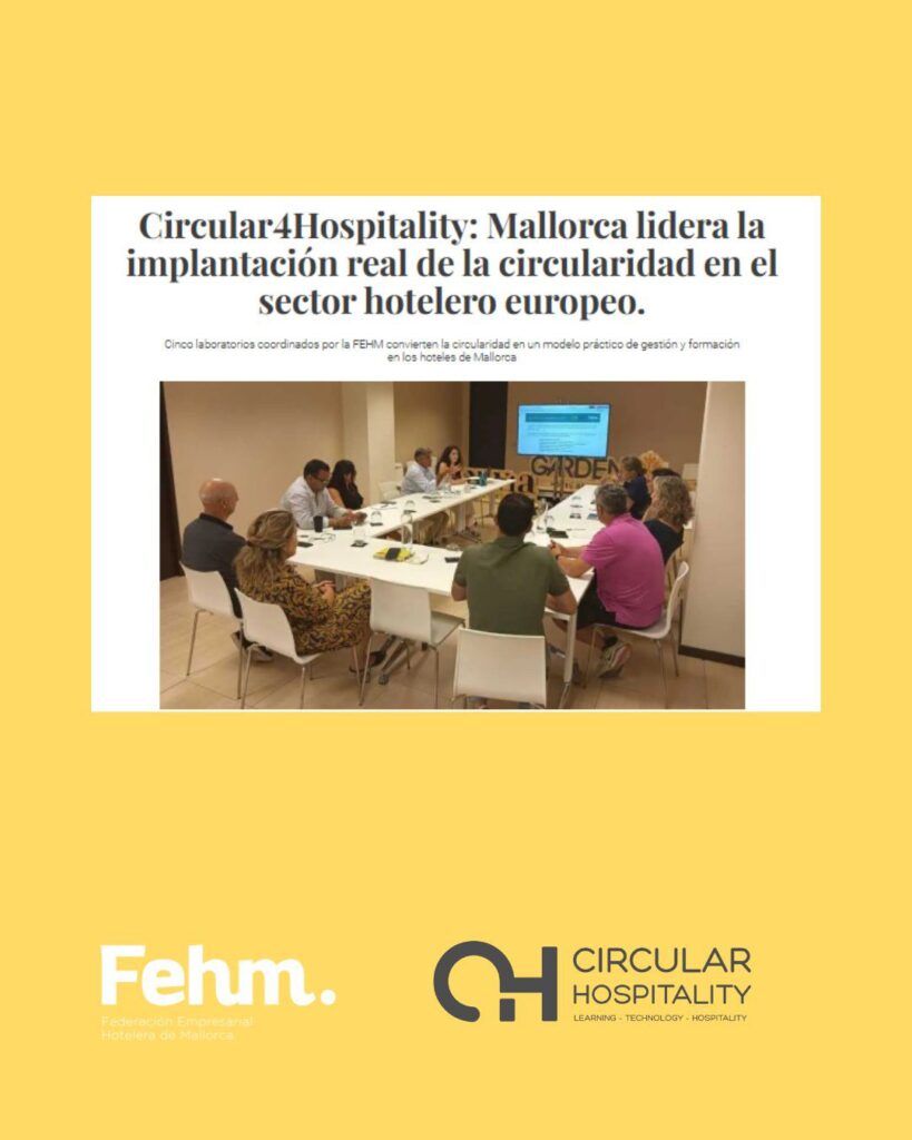 El consorcio CIRCULAR4Hospitality liderado por la FEHM junto a partners de Italia, Grecia, España y Turquía del sector tecnológico, hospitality y formación, te invita a participar en el Evento Final: Conferencia Europea Circular4Hospitality, que tendrá lugar el 27 de noviembre de 2025 en el hotel BQ Augusta, Palma